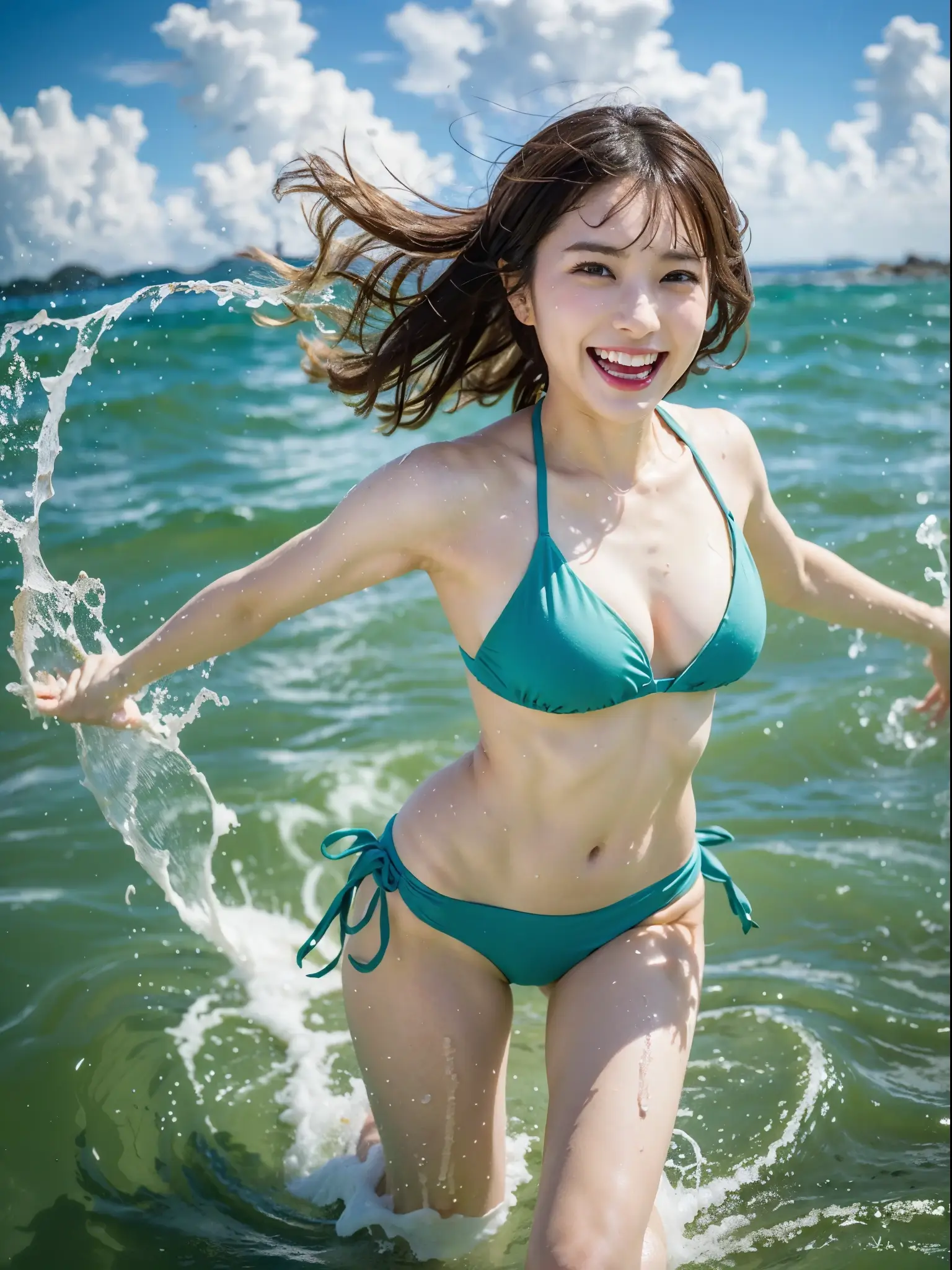 Captured in a burst of movement, a beautiful Japanese woman runs through the surf, water splashing around her legs. She sports a vibrant, neon green bikini, which pops against the white sand and the crystal-clear water. Her expression is one of exhilaration and freedom, her mouth open in a laugh, her eyes sparkling with joy. The camera angle is low and close, emphasizing the action and the splash of the water, with the beach stretching out into the distance <div><br></div>