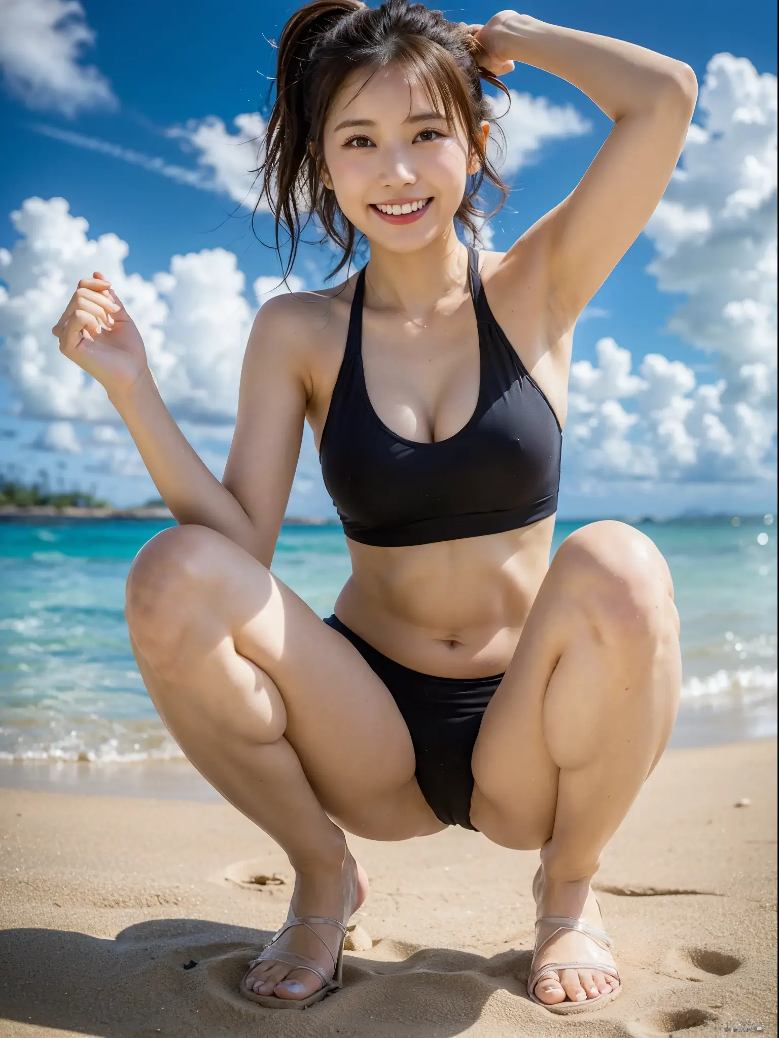 Captured in a dynamic squatting pose with her legs spread in an ‘M’ shape, a beautiful Japanese woman poses near the water’s edge on a Hawaiian beach. She’s wearing a playful, pink two-piece swimsuit, complementing the cheerful vibe of the setting. Her expression is one of fun and flirtation, perfectly suited to the casual and relaxed atmosphere. The crystal-clear water and the bright, sunny sky form a stunning backdrop, highlighting her figure and the joyful essence of beach life