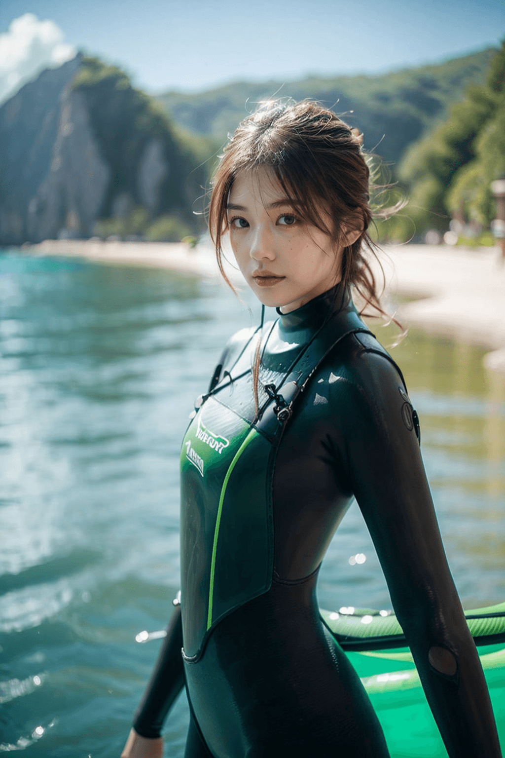 サーフィンのプロンプトと一緒に活用すると、さらにウェットスーツを正確に表現してくれるイメージがあります。