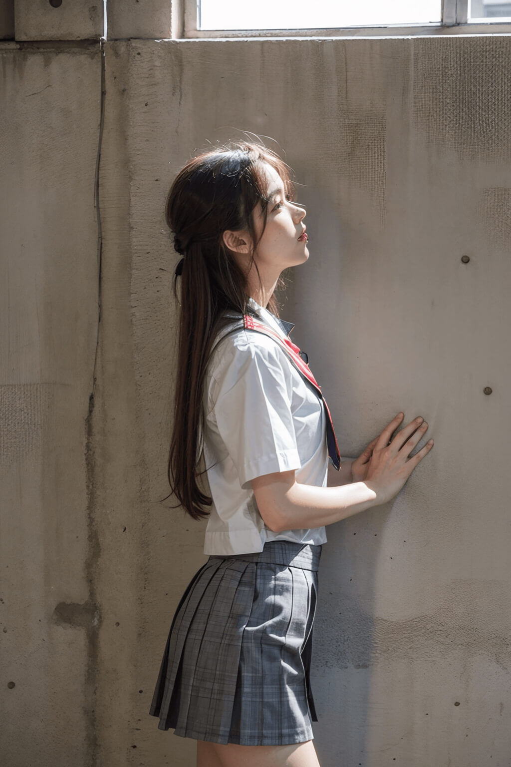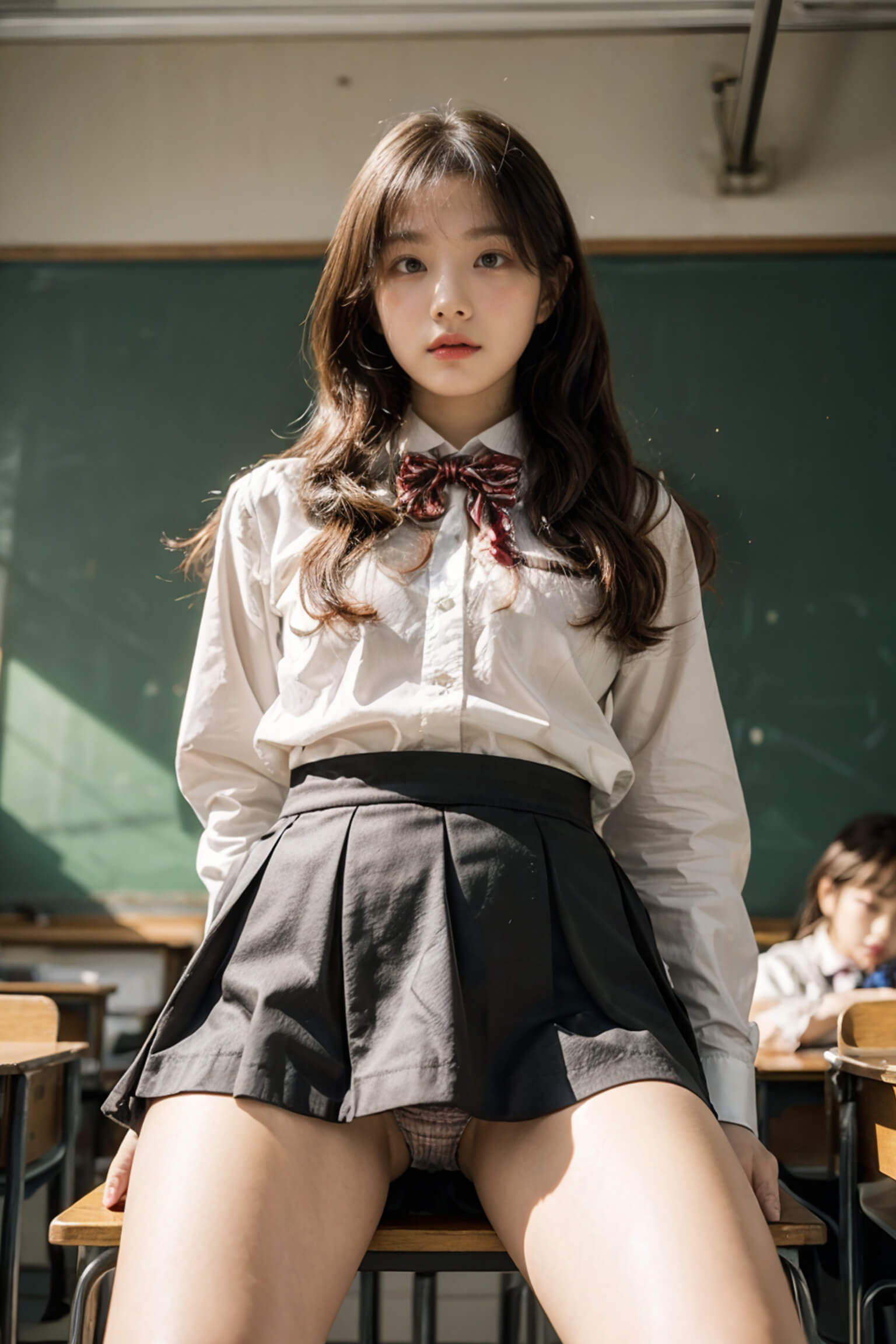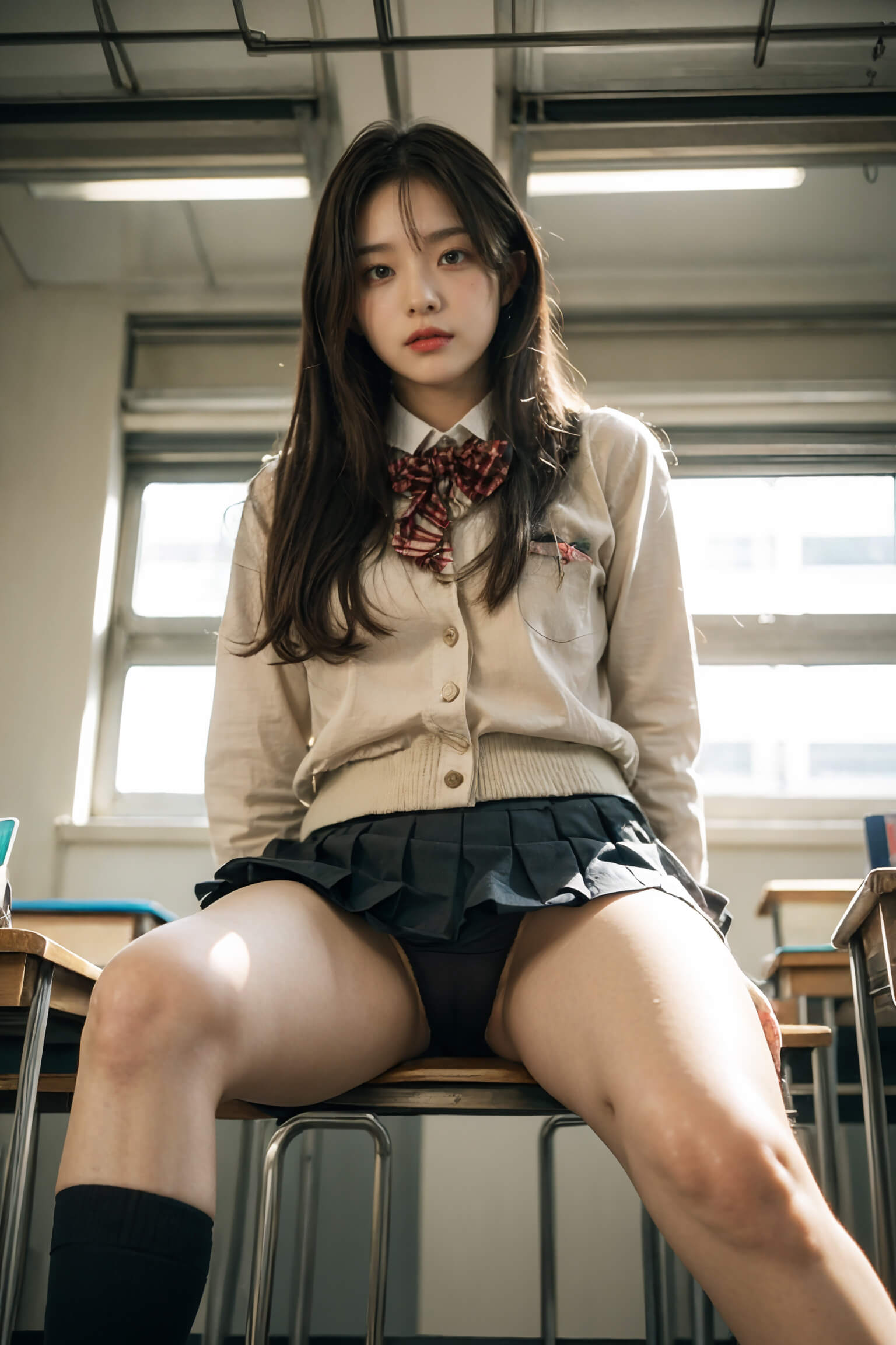 looking downと併用することで、このようなセクシーなアングルを生成することもできます。パンチラのプロンプトを含めることで、更に被写体をしっかり足上から写す確率が高まっています。